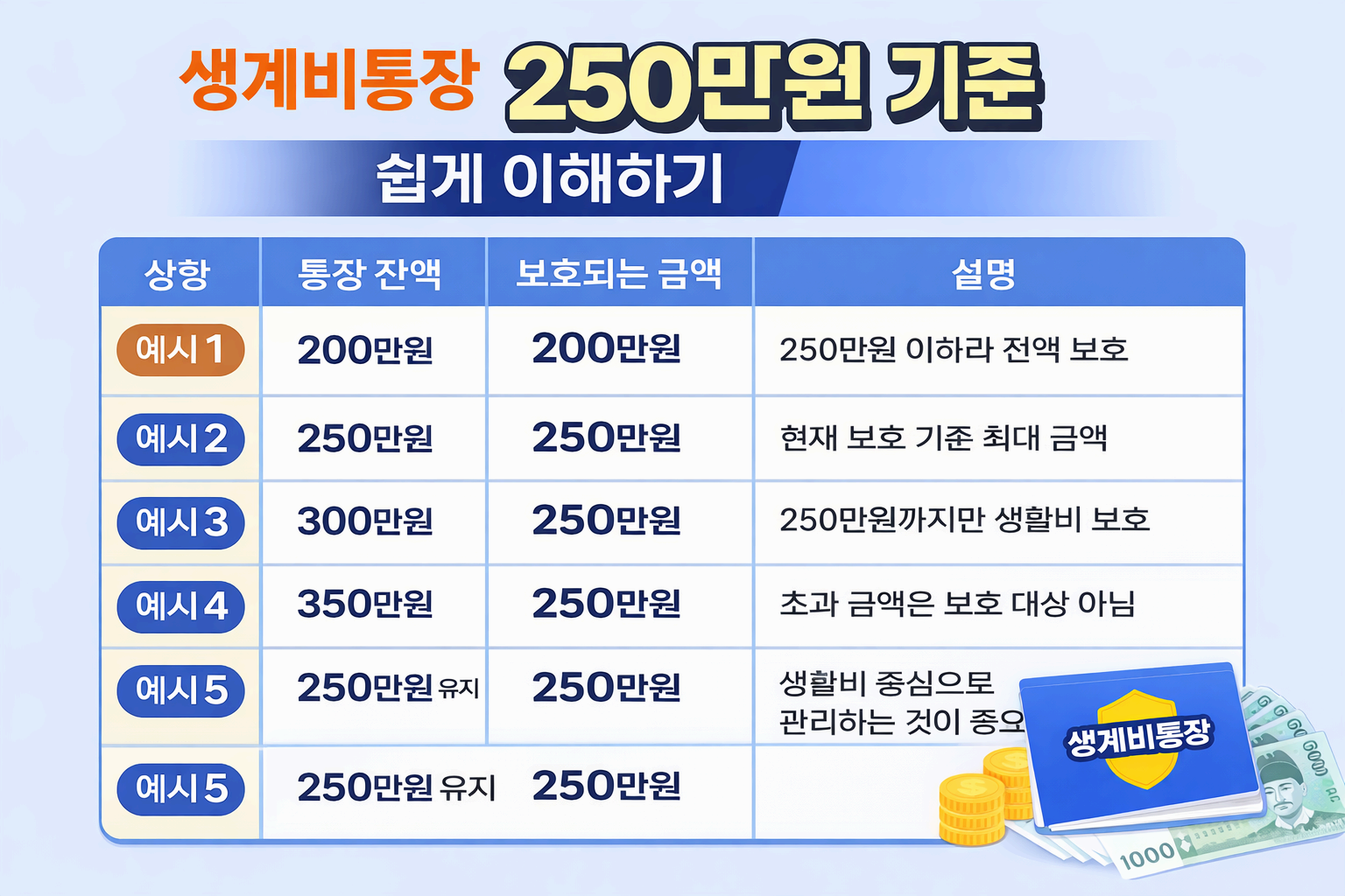 하지만 생계비통장은 250만원이 보호 기준입니다.